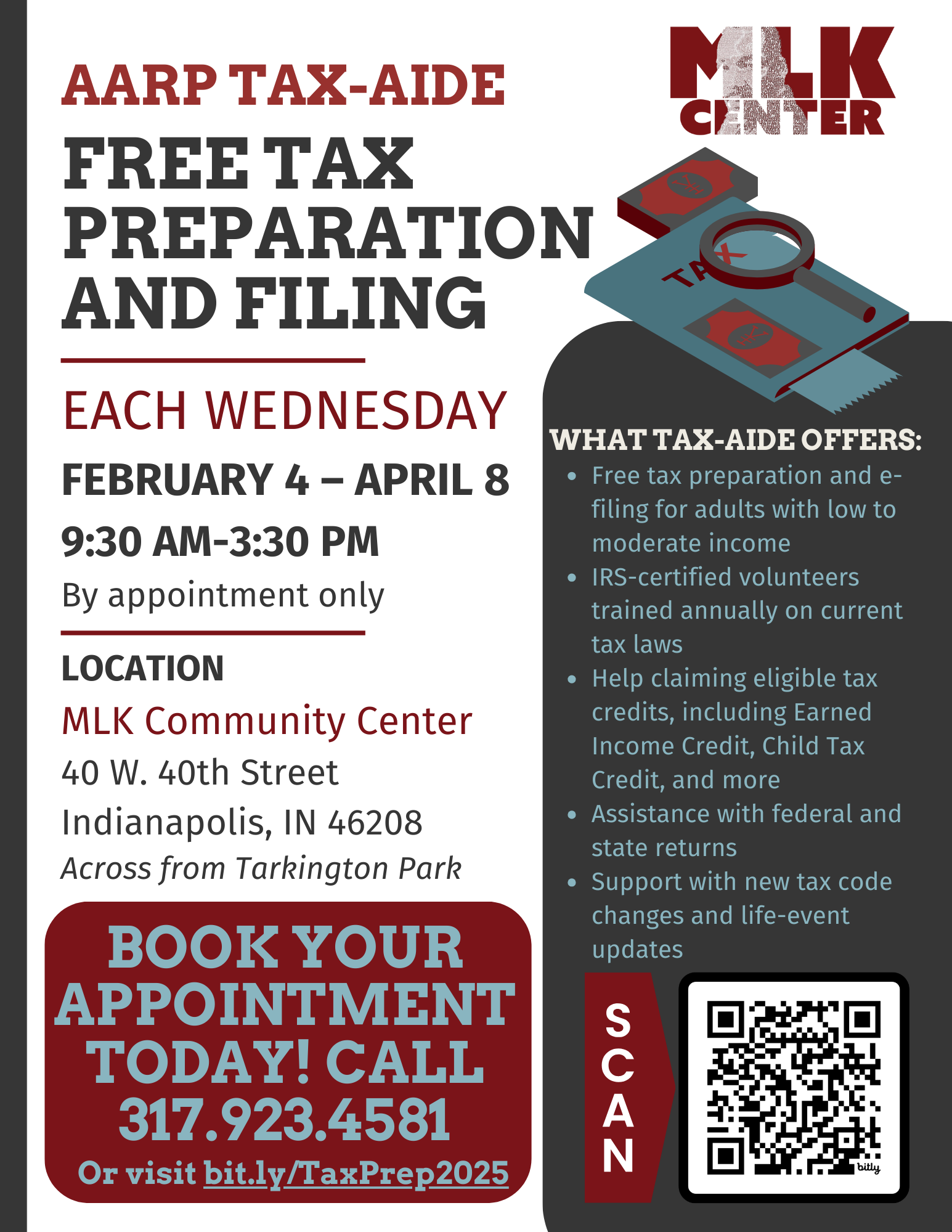 The MLK Center and AARP Tax-Aide are joining forces to help provide a smoother tax filing experience for all of our neighbors. Make your appointment today.